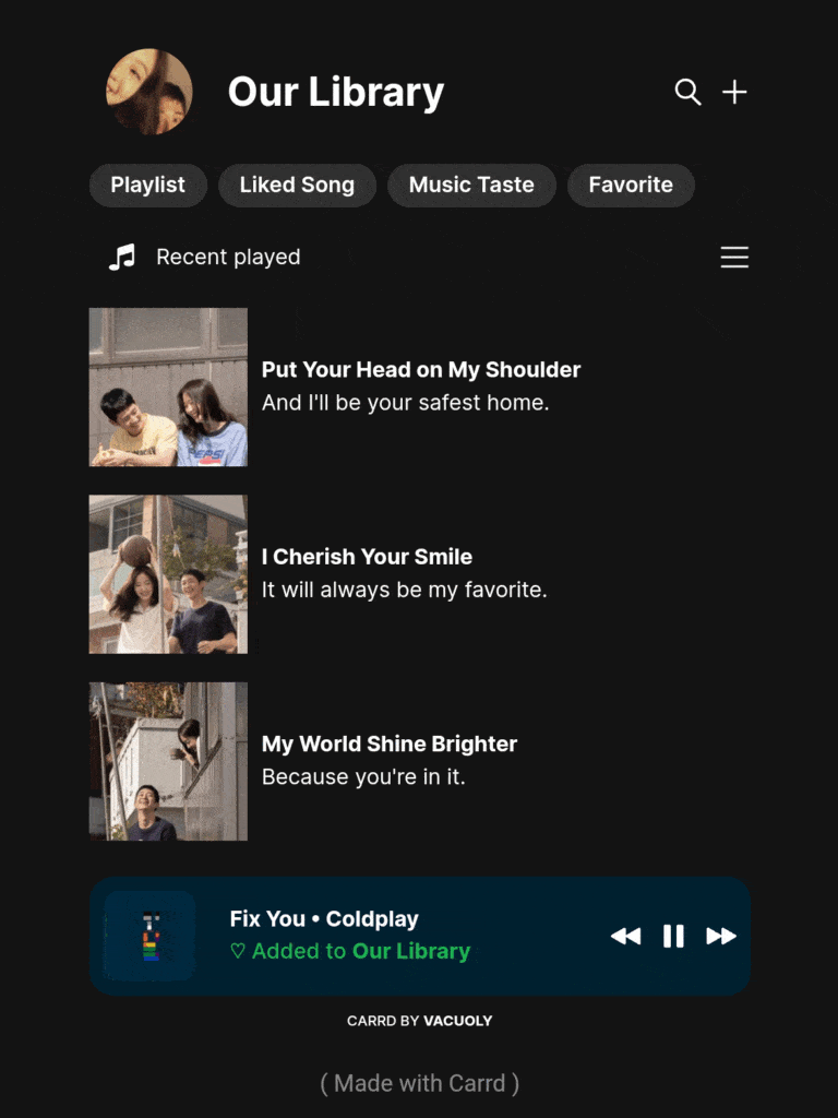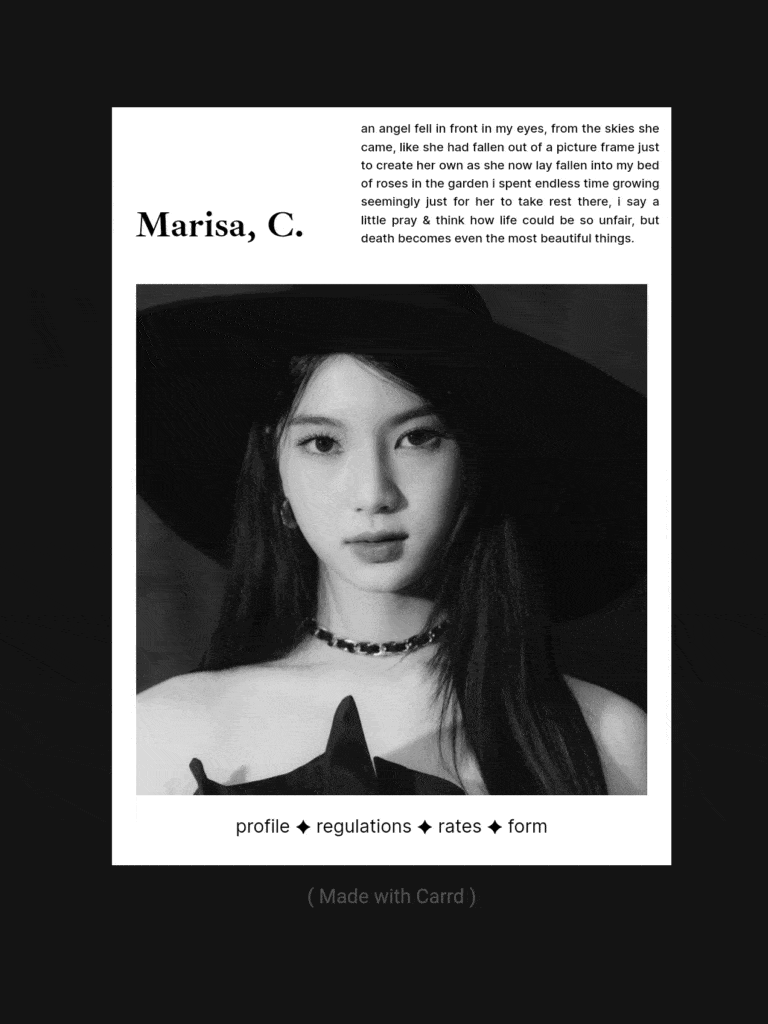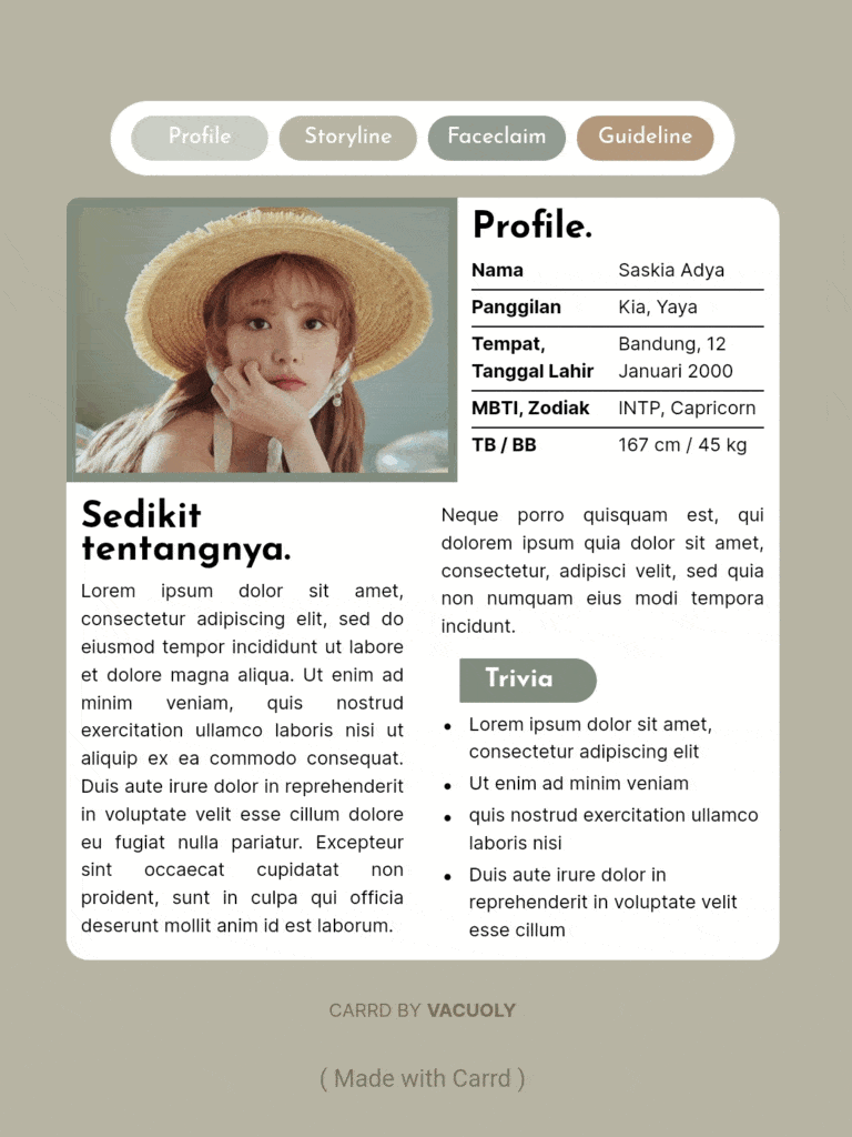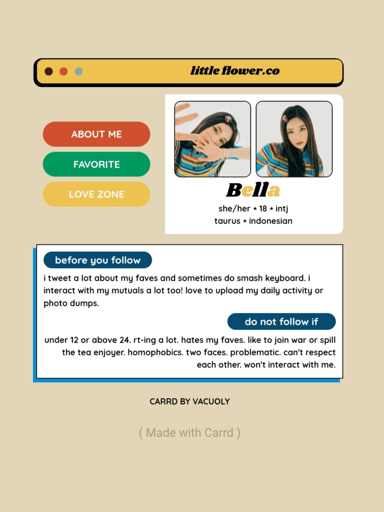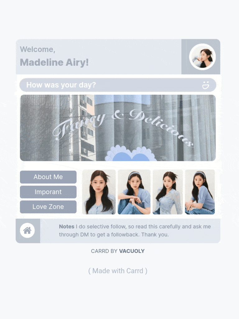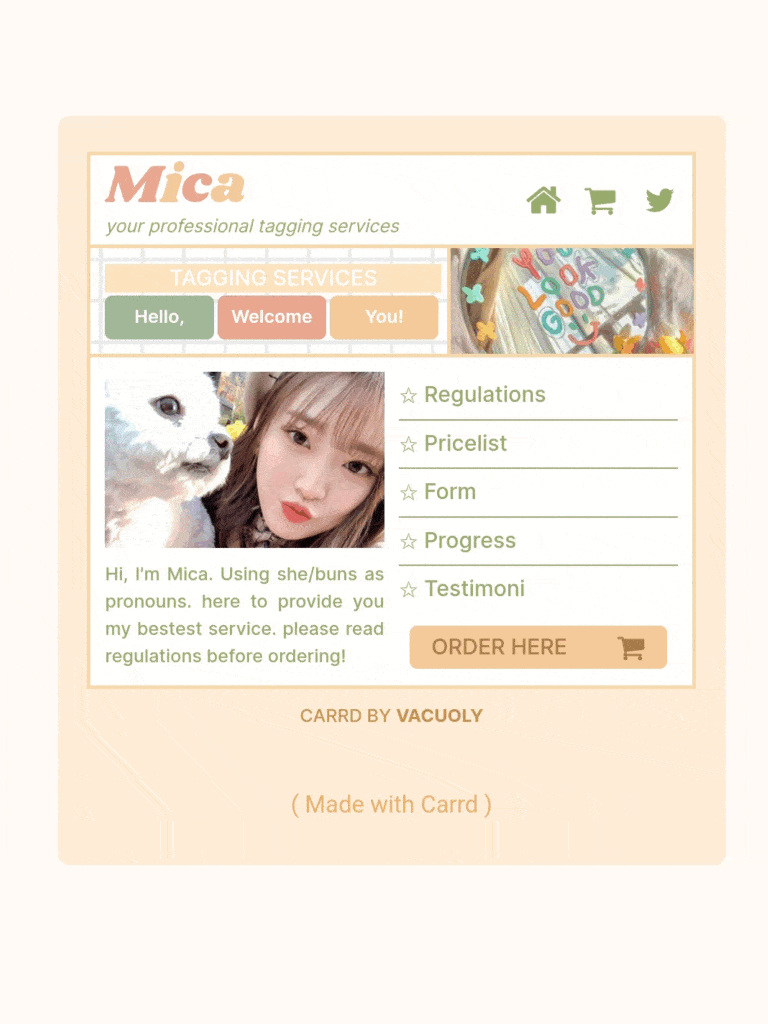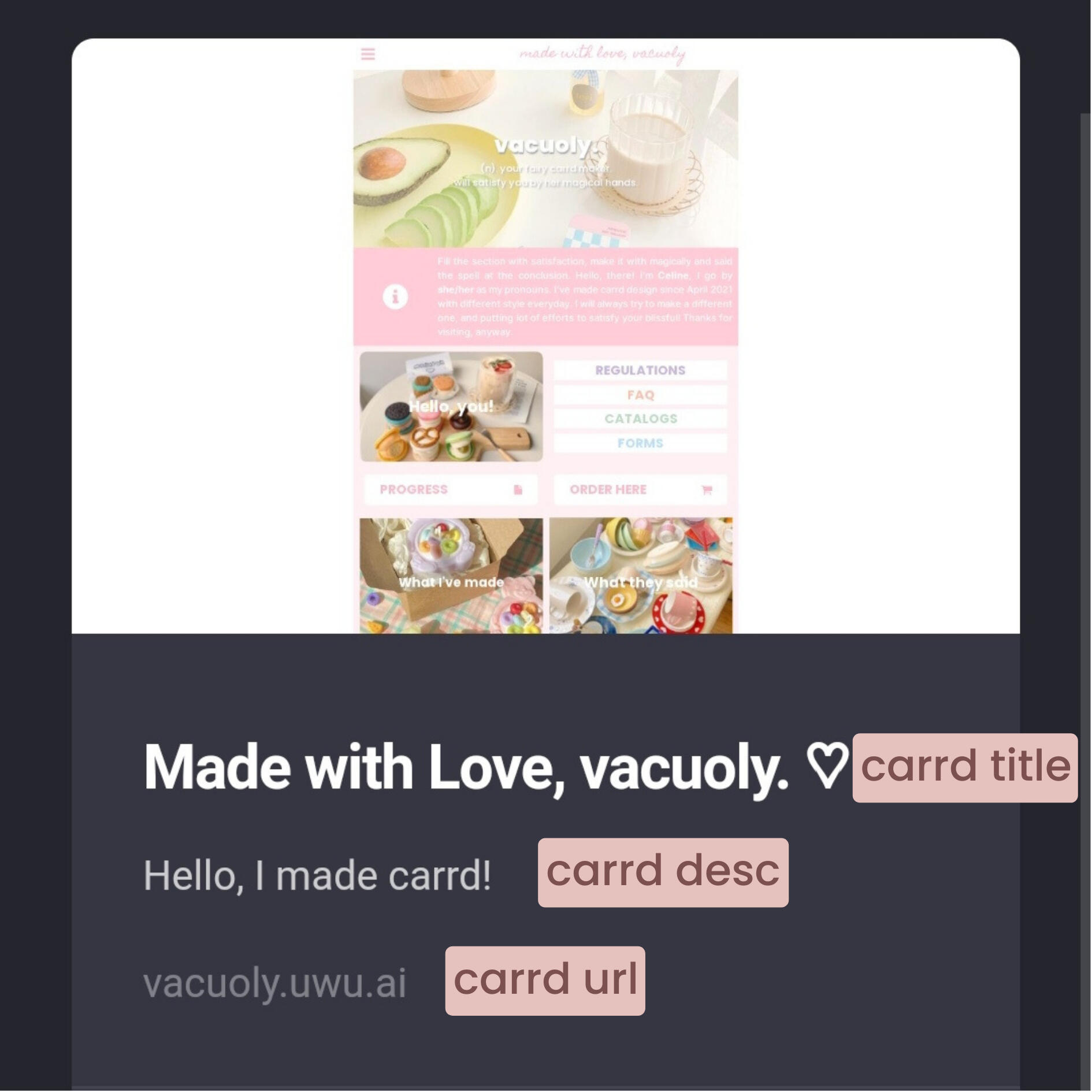 All carrds will include a credit that reads "carrd by vacuoly". If you wish to remove this credit, an additional fee of +Rp 4,000 will apply.