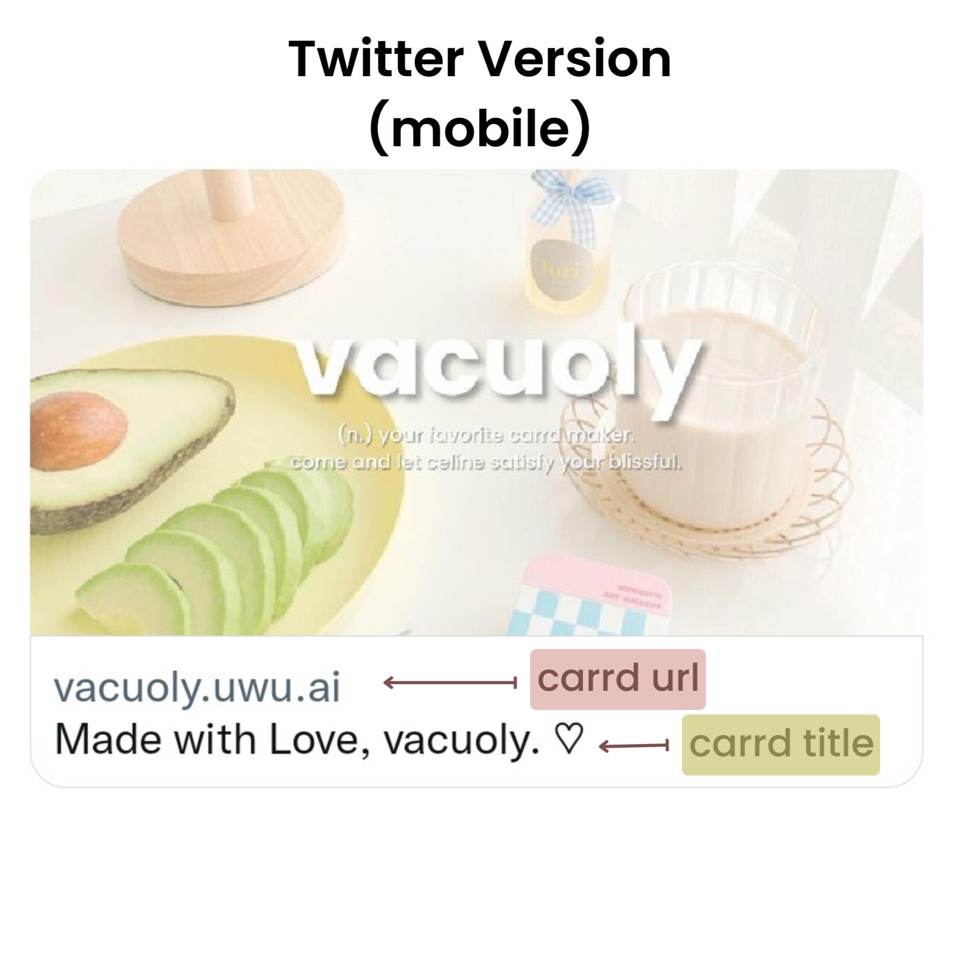 . Carrd Description / berfungsi untuk deskripsi singkat carrdmu. Carrd desc bersifat opsional untuk diisi, karena nggak terlihat ketika kamu buka di mobile. Carrd description hanya terlihat untuk versi web saja. (Twitter atau Telegram)