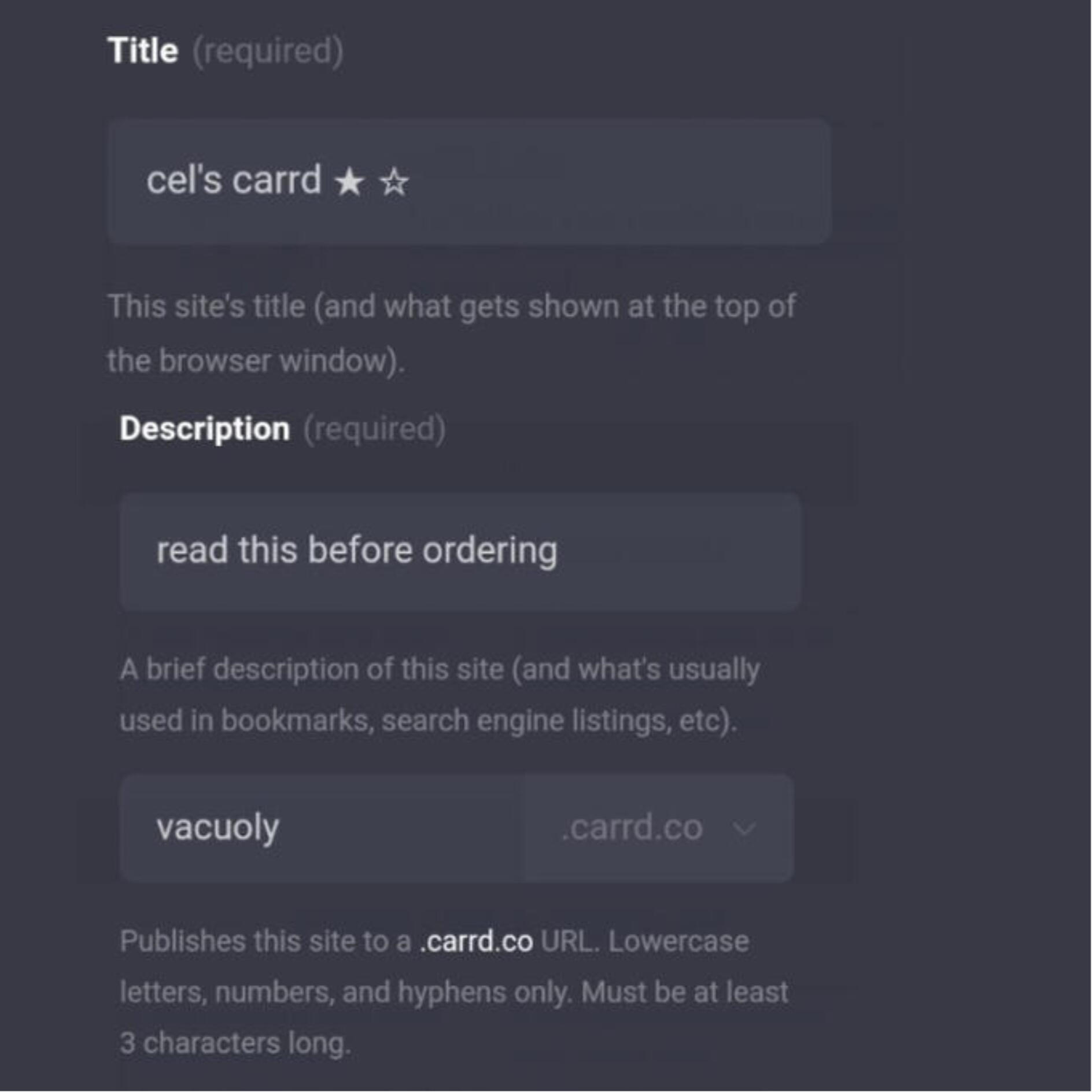 . Carrd URL / merupakan nama yang dipakai untuk link carrd kamu (Contoh : vacuoly.uwu.ai). Carrd URL hanya bisa dipakai untuk satu carrd aja, jadi pastikan Carrd URL kamu available ya.