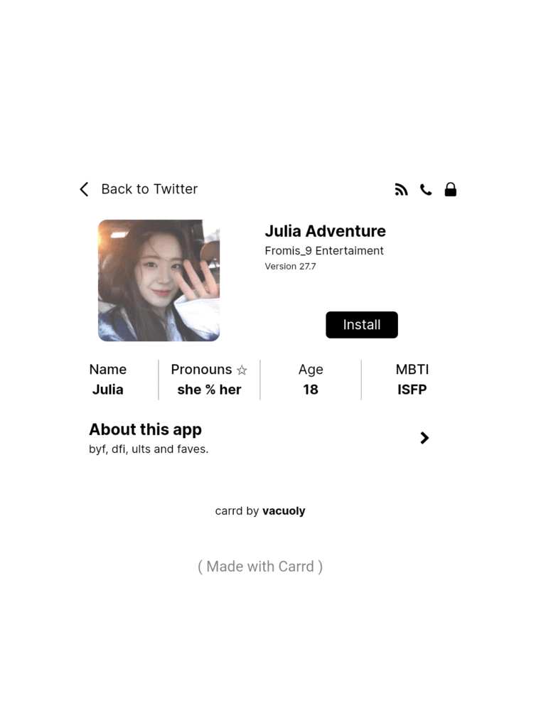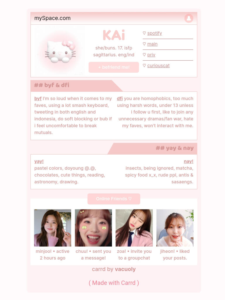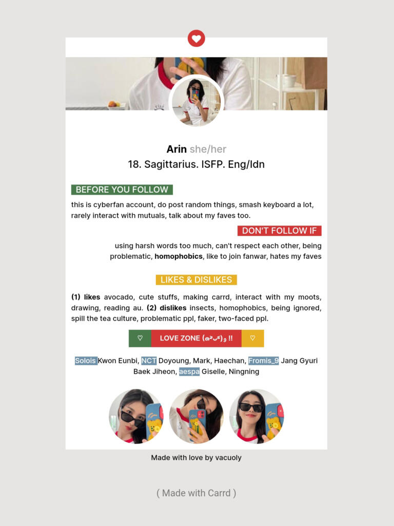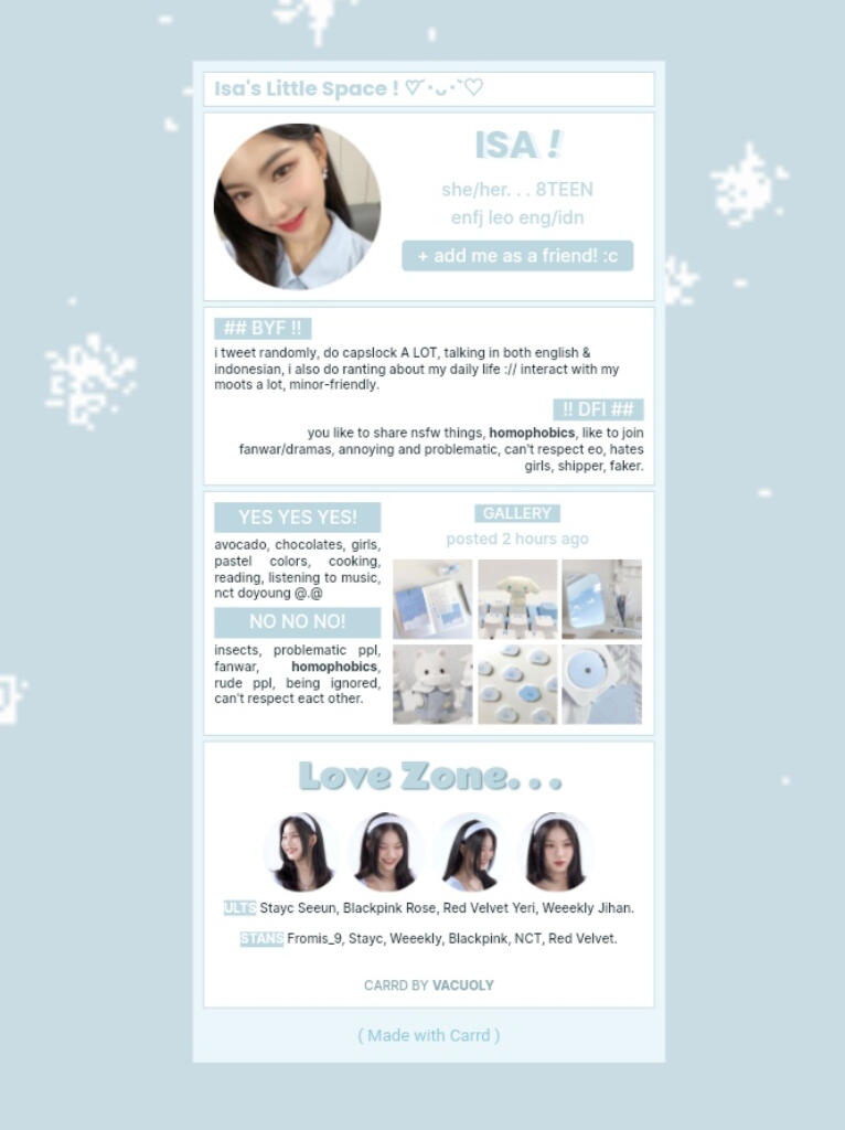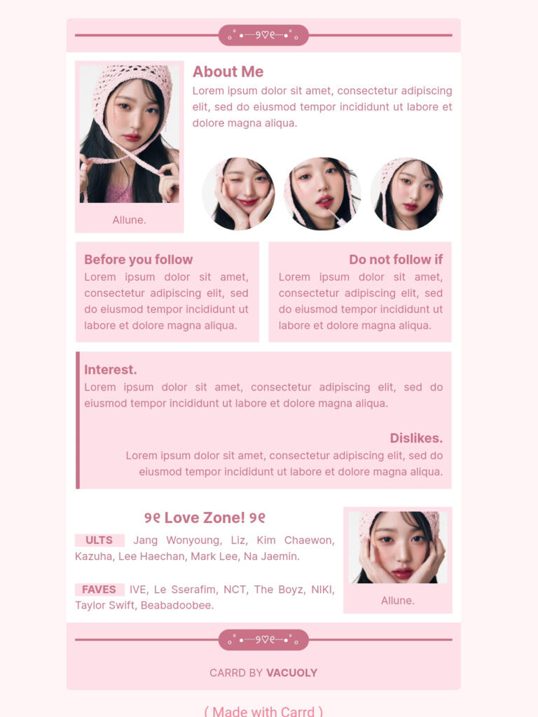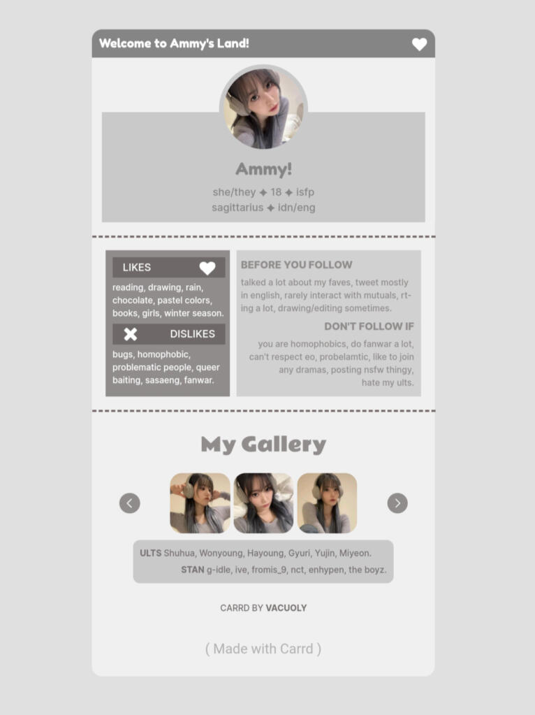 Dislikes : bugs, blood, ghosts, spicy food, two-faces ppl, being ignored, hate speechFaves : Fromis_9 Gyuri, Saerom, Jiheon. NCT Mark, Doyoung. Loona Gowoon, Yves. Weeekly Zoa, Jihan.III. Carrd Theme