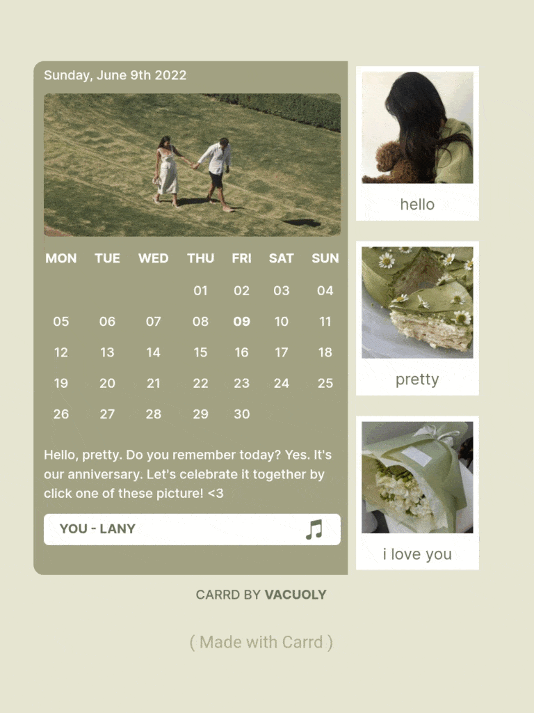 January 2nd, 2024 : January 9th, 2023Lorem ipsum : Hello, there, Spider-Mark. Today is the day where we confessed our feelings. The day where I can't believe that someone like you will be someone who I adore until now.You are so precious and you deserve all the happiness in this world. Mr. Spider-Mark, please remember that you are the reason why I have the smile, you have a lot of people who loves you especially me. So, don't think to much about what other say, okay baby boy?Once again, happy anniversary babe. I love you to the moon and never back.III. Carrd Theme